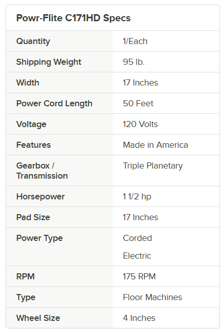 If you find yourself in a pinch mid-clean, you won’t have to worry with this Powr-Flite Classic C171HD 17″ metal floor machine! This floor machine has been designed to provide you with ultimate cleaning convenience, as its 1 1/2 hp motor and triple planetary drive system provide an output of 175 RPM to polish, scrub, or strip stubborn grime and dirt from your floors. The unit itself comes with a cushioned grip handle, keeping your hands from cramping while vacuuming. In addition, the handle features a dual lever on / off switch for safety.